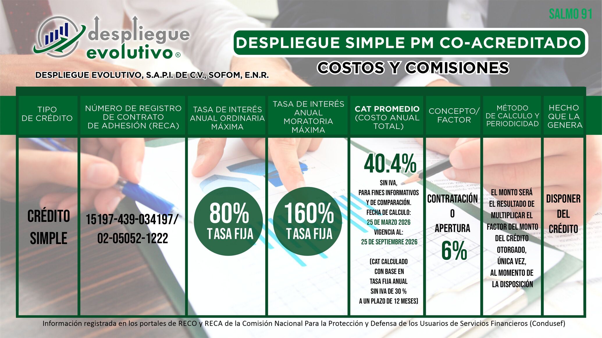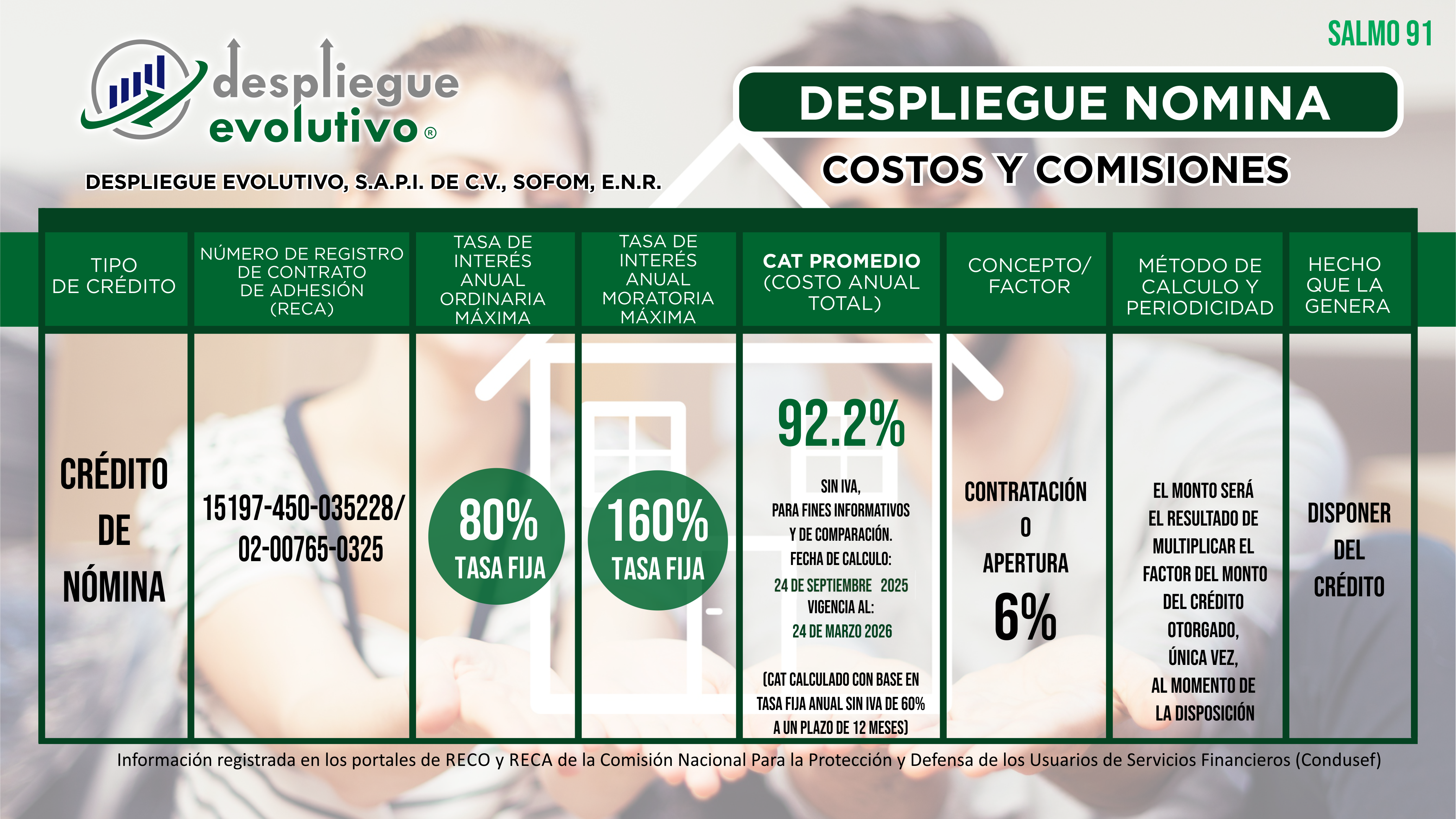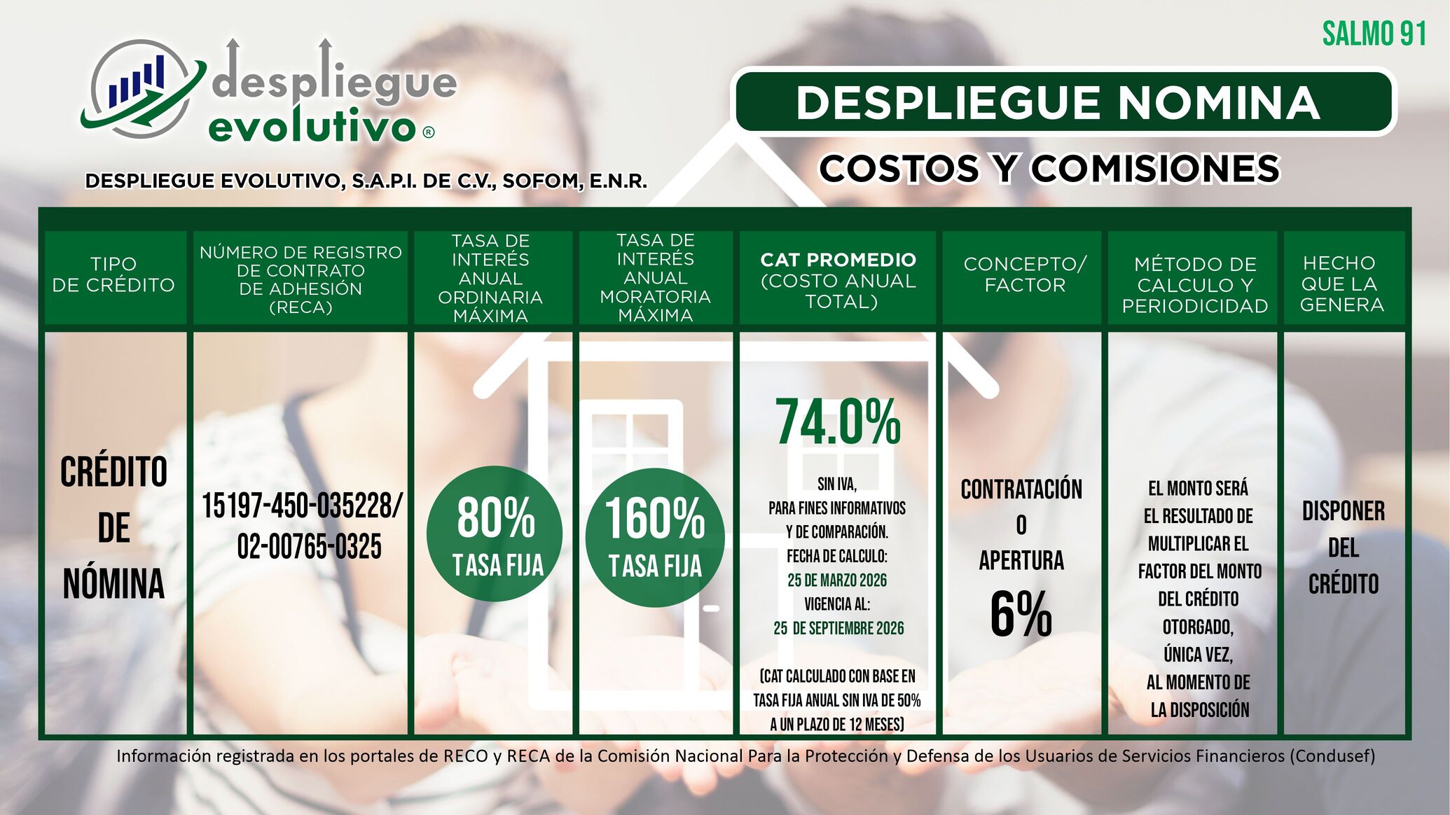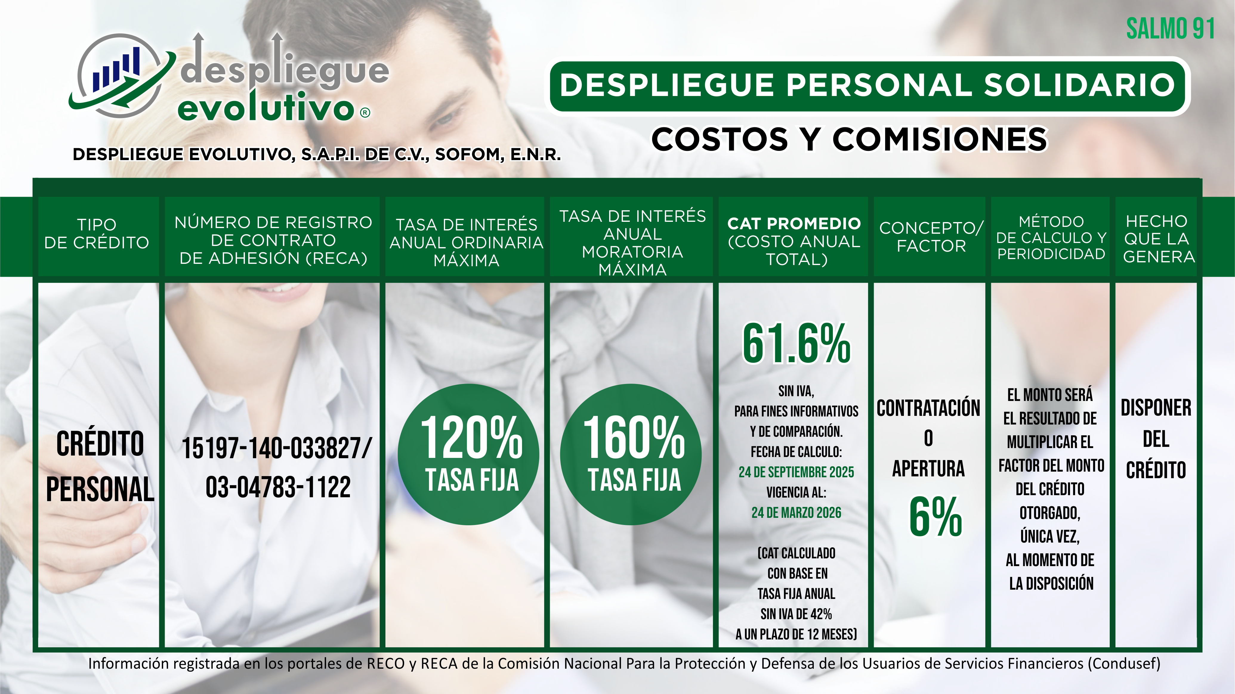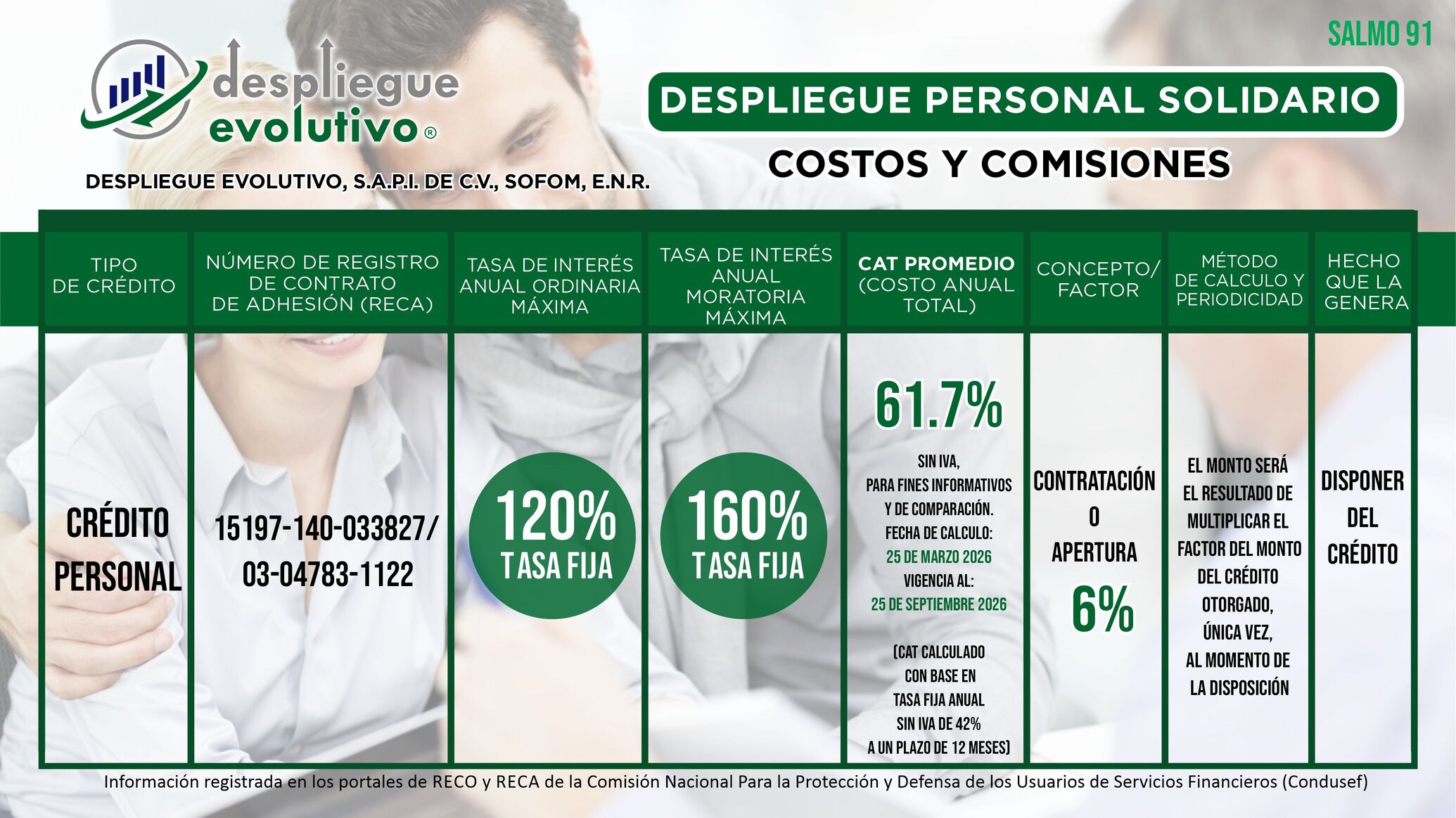 "Despliegue Evolutivo, S.A.P.I. de C.V., SOFOM, E.N.R." da a conocer los Costos y las Comisiones que Cobramos en Nuestros Productos Financieros. No olvides que el monto de las comisiones o factor, tasa de interés y el Costo Anual Total (CAT), depende de la evaluación y resultado de tu crédito.