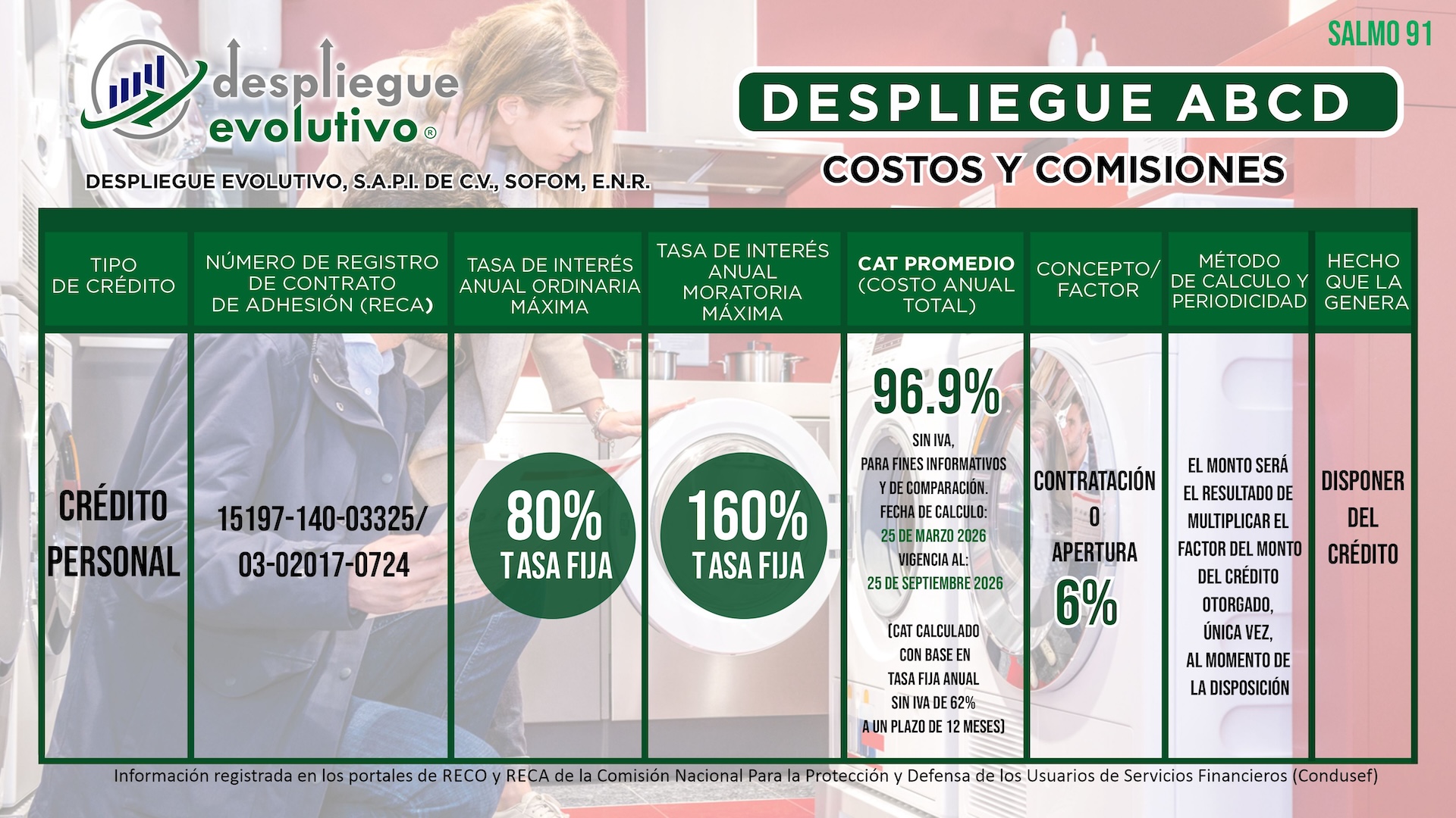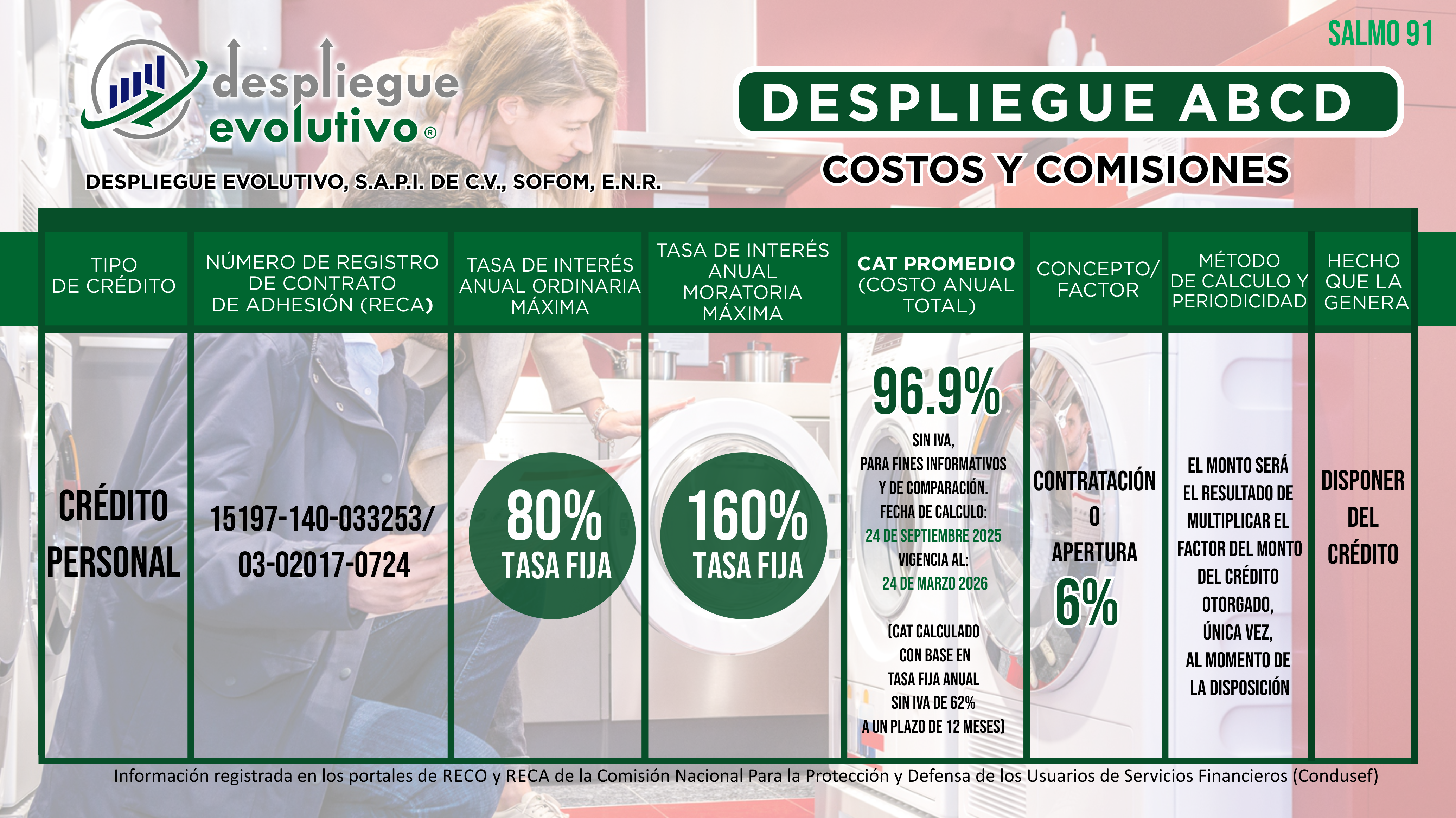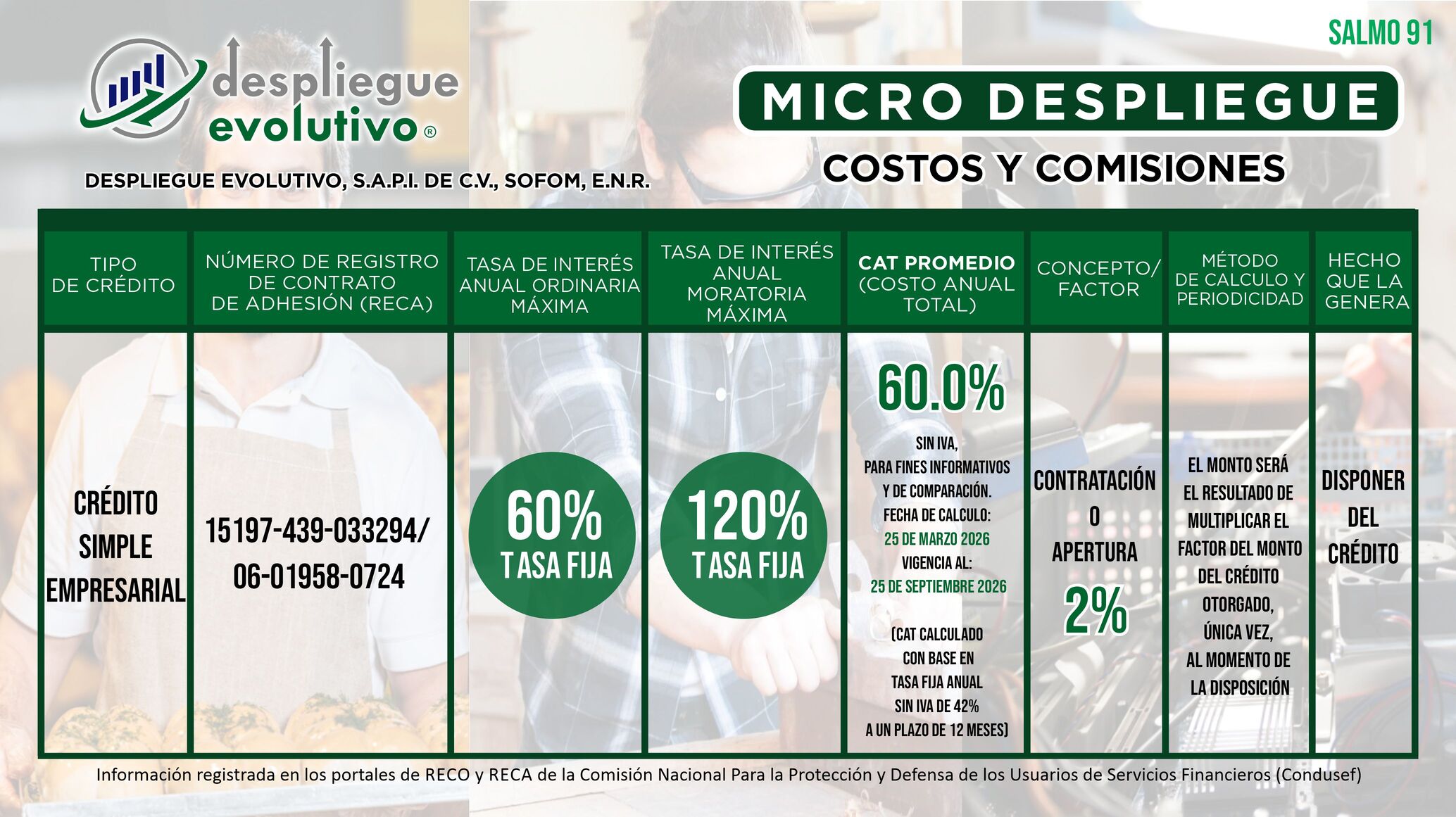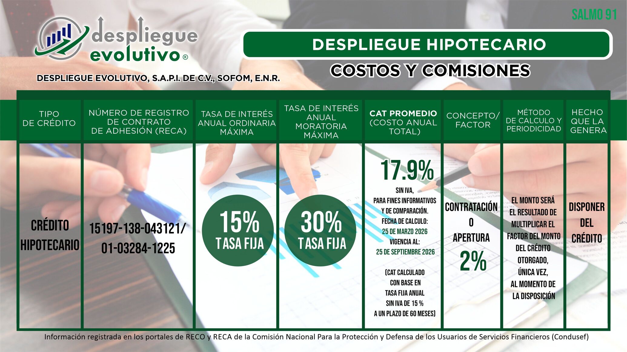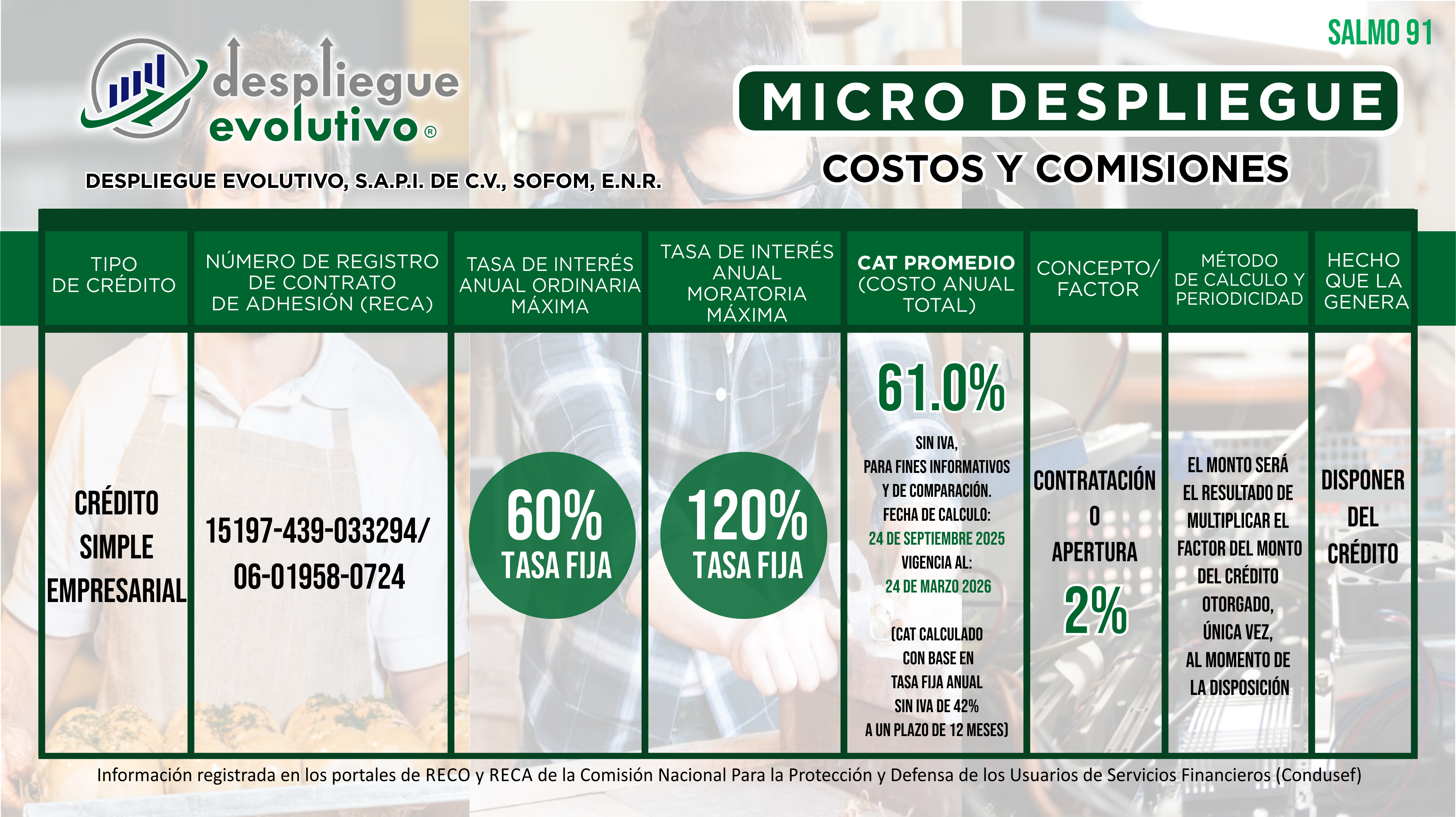 "Despliegue Evolutivo, S.A.P.I. de C.V., SOFOM, E.N.R." da a conocer los Costos y las Comisiones que Cobramos en Nuestros Productos Financieros. No olvides que el monto de las comisiones o factor, tasa de interés y el Costo Anual Total (CAT), depende de la evaluación y resultado de tu crédito.